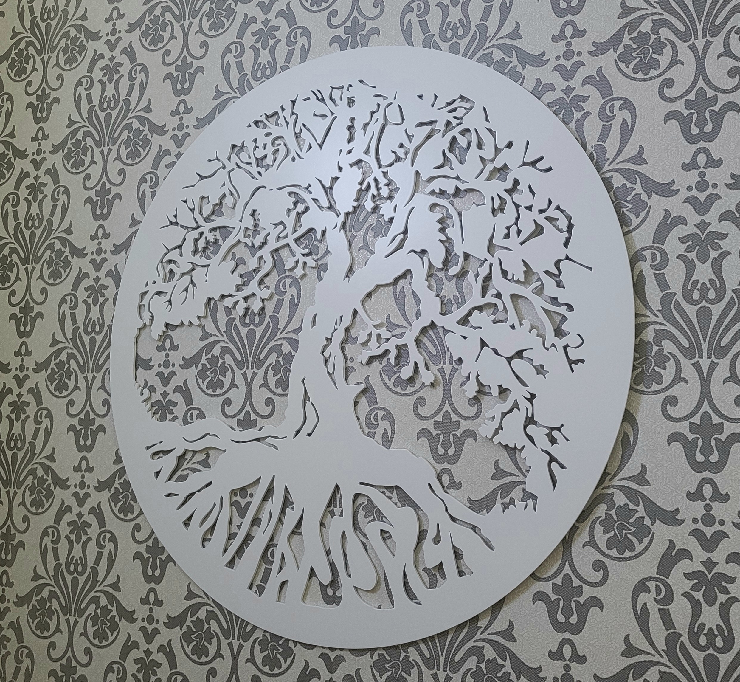 Decoratiune – "Copacul Vietii". Este realizata din material MDF, nuanta: Alb. Dimensiuni: 80cm x 80cm