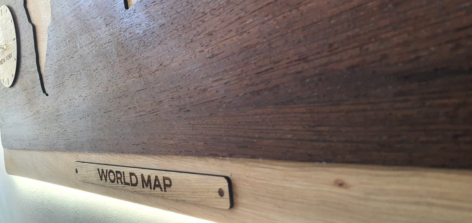 Nuante: wenge (lemn), stejar natur si prun (894 lei/bucata) sau material HDF nuante wenge si stejar, cu ceasuri incorporate functionale cu trei fusuri orare diferite( in functie de orasul ales de pe harta).