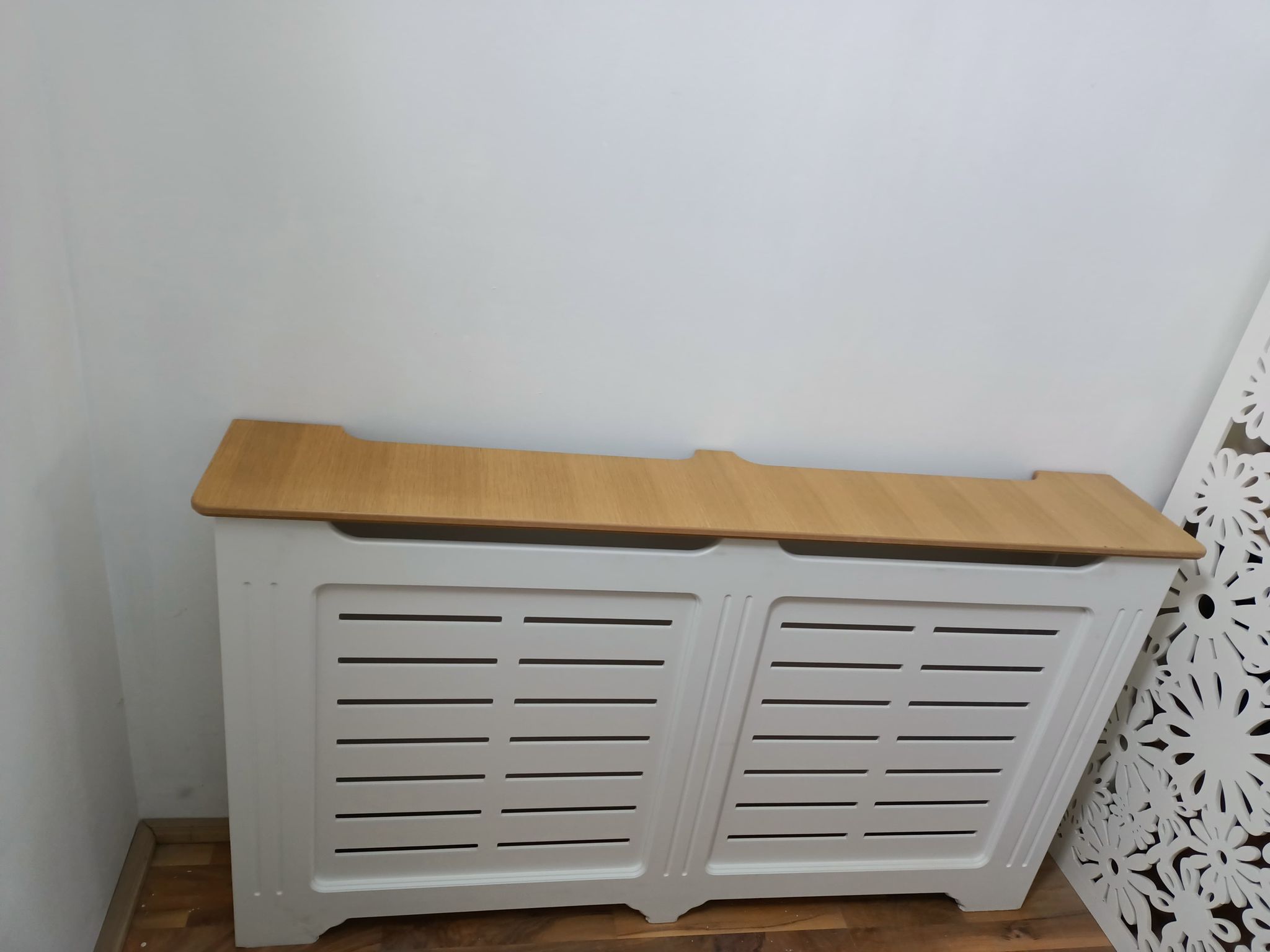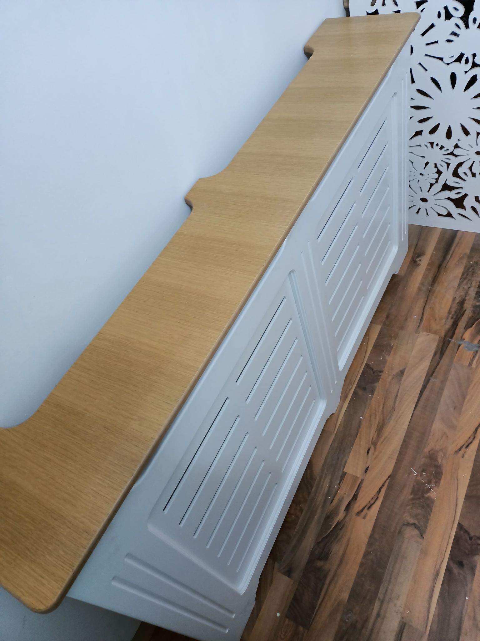 Masca de calorifer din material MDF vopsit alb, cu gravuri pe lateral si cu polita din MDF furniruit si baituit, nuanta stejar caramel.