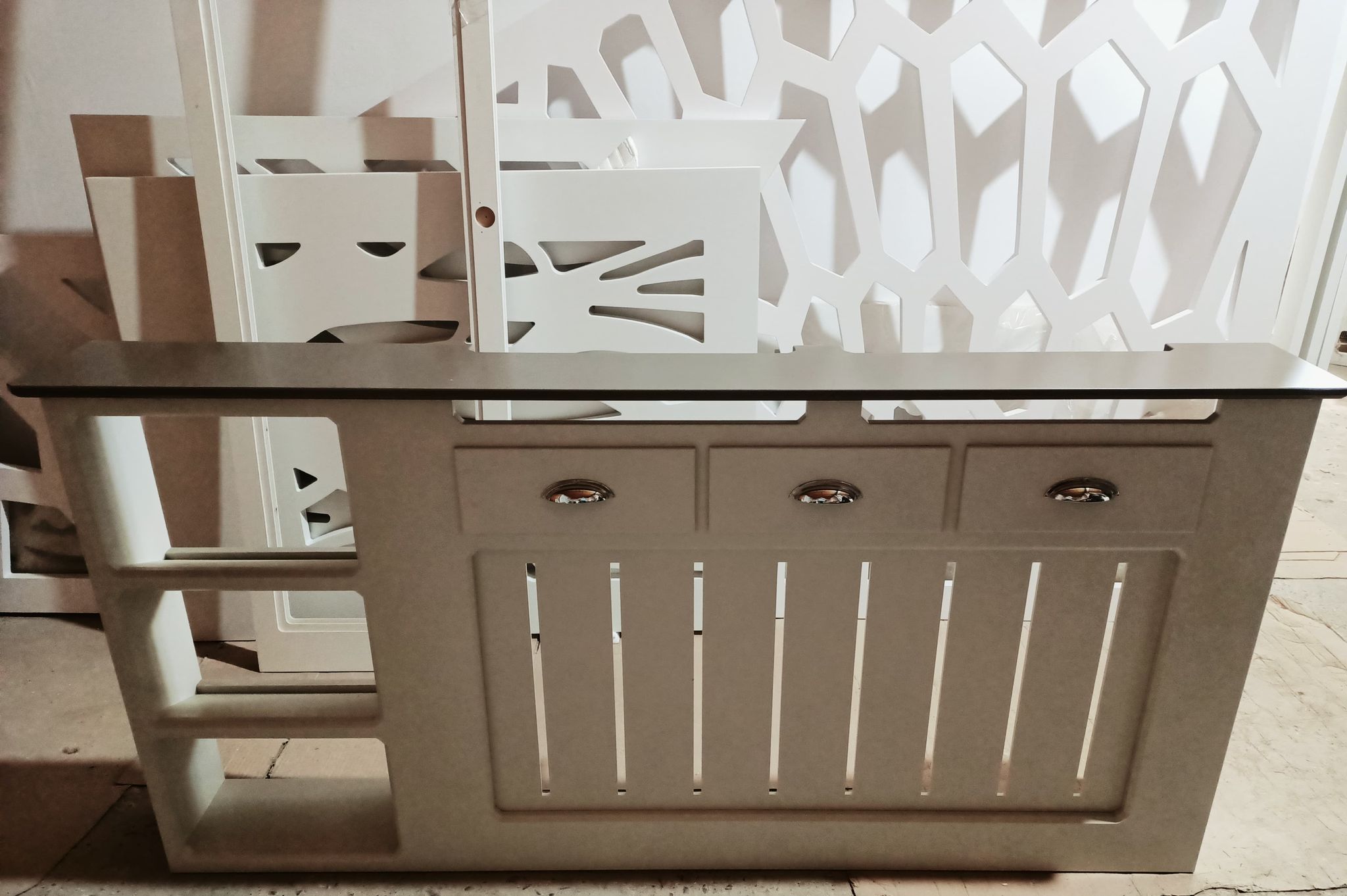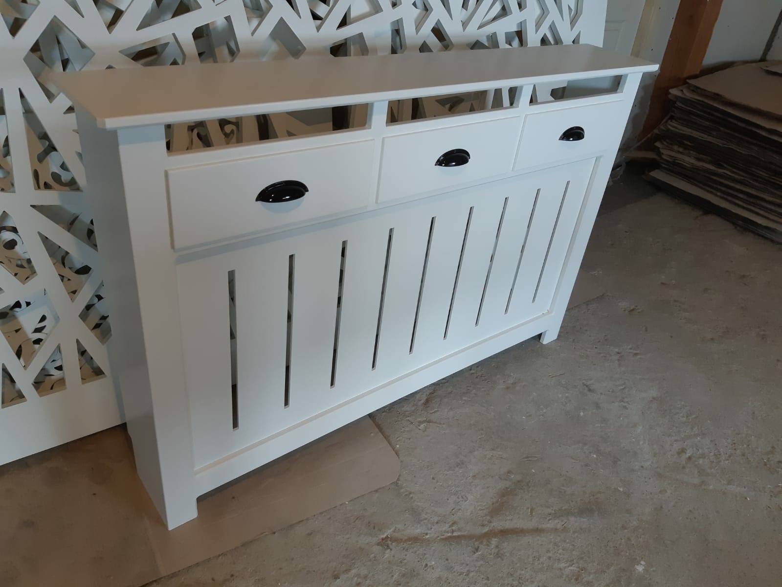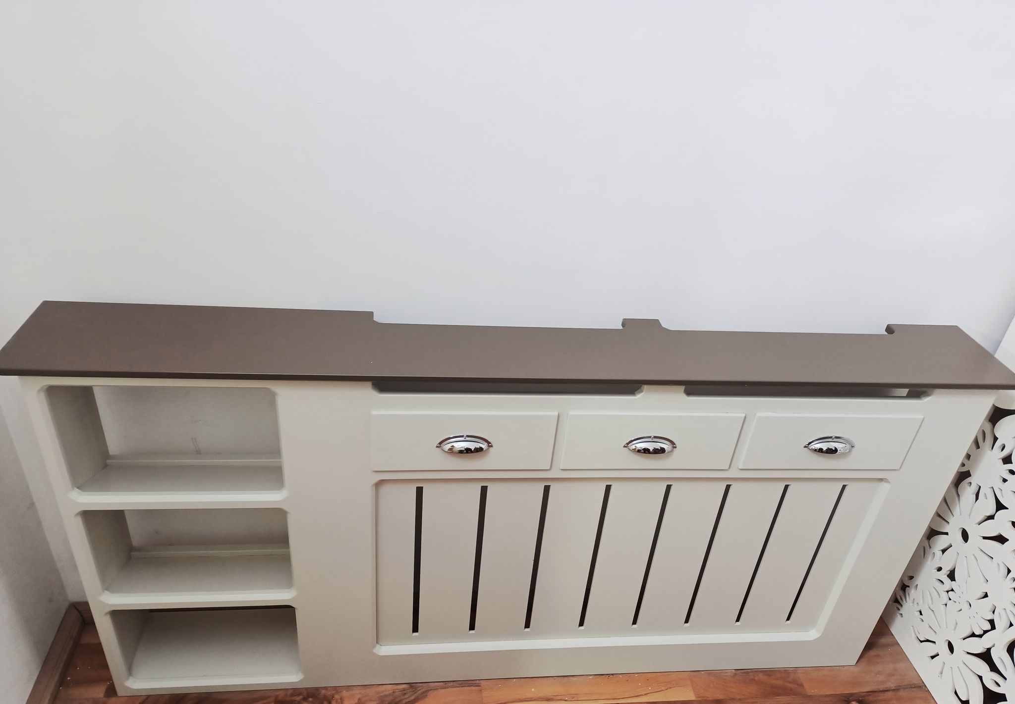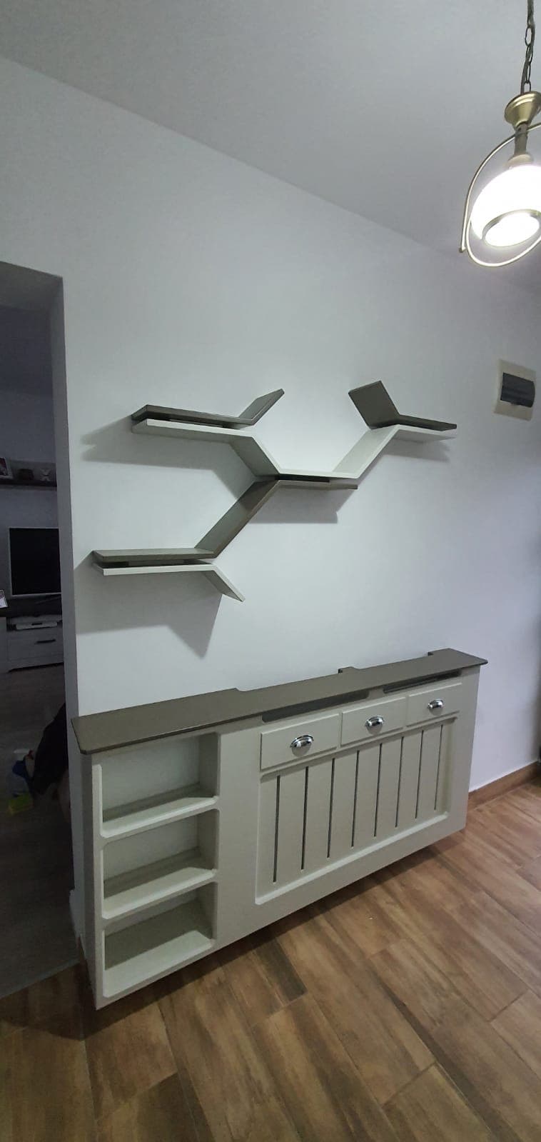 Masca de calorifer suspendata, din material MDF vopsit in doua nuante, cu sertare (nefunctionale, dar la cerere se pot realiza astfel incat sa fie functionale) si rafturi.