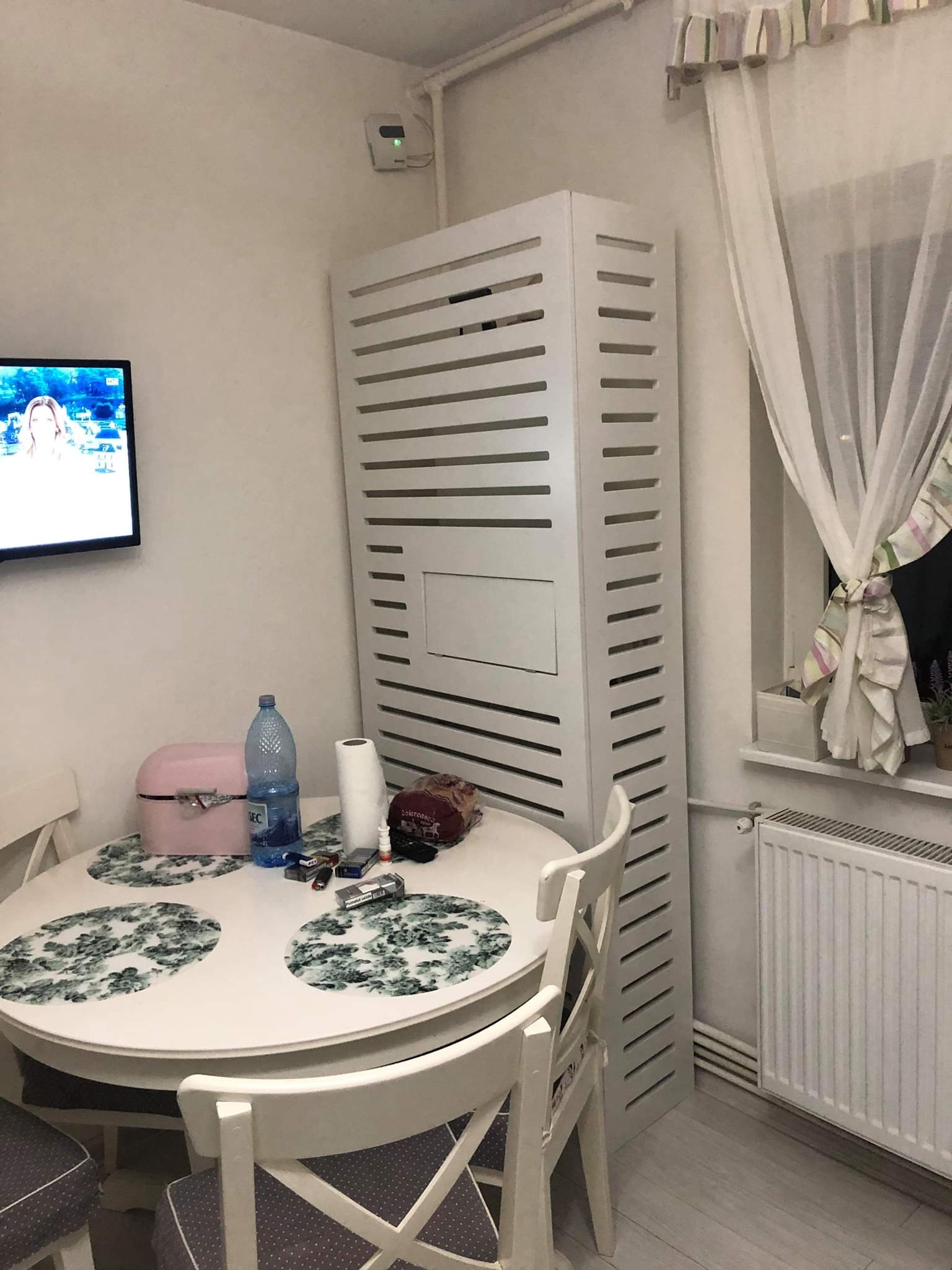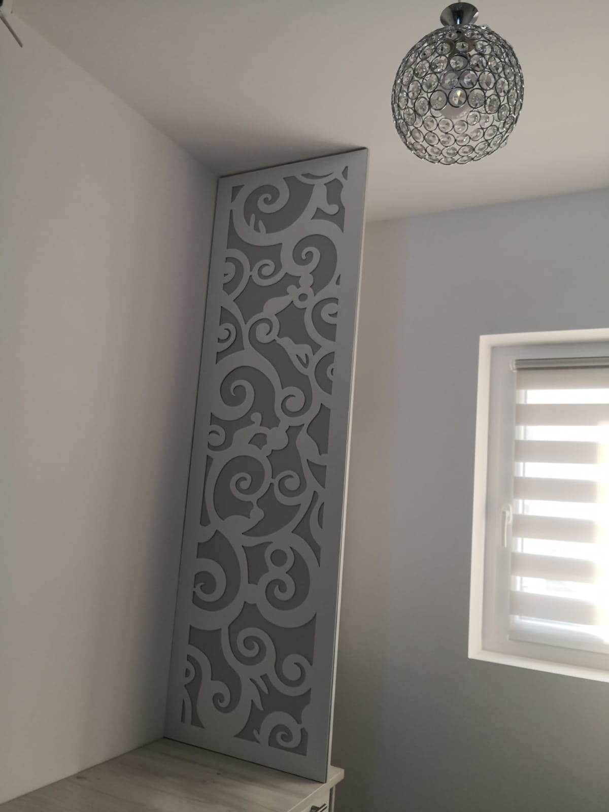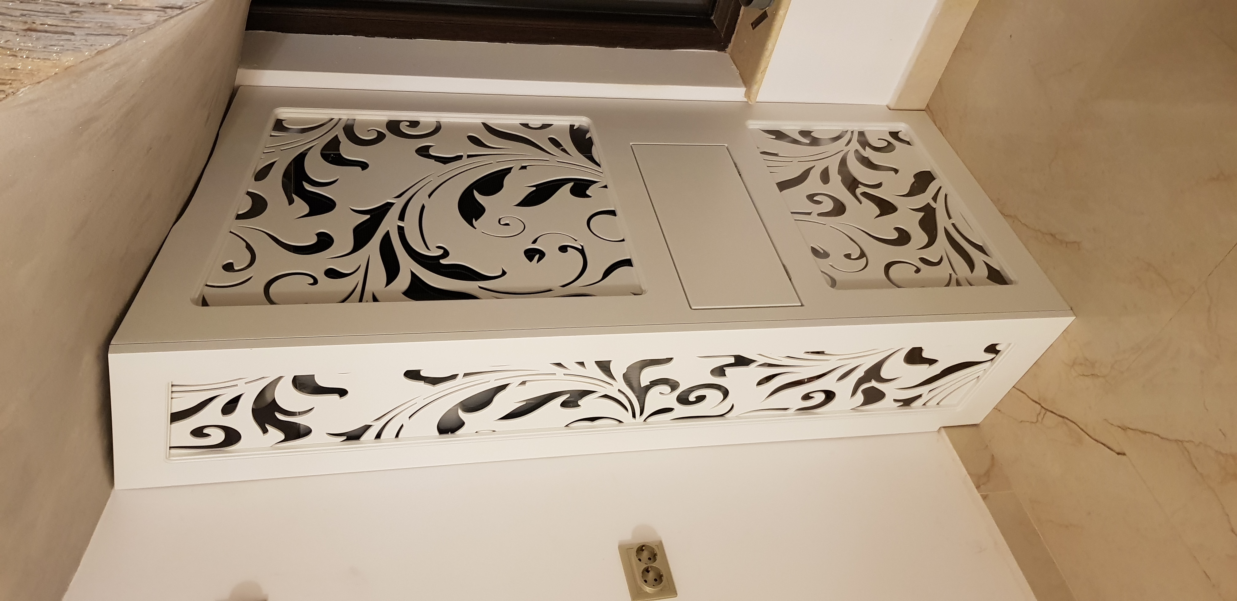 Masca pentru tevi vopsita, culoare la alegere din catalogul de culori RAL, material MDF. Material PVC se poate realiza doar pe alb. Extracost se va aplica pentru culorile metalizate, combinatiile de culori si MDF furniruit.