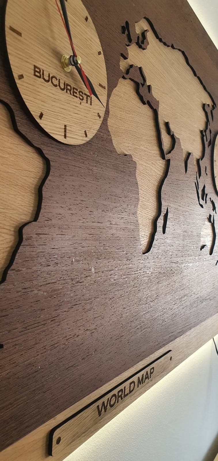 Nuante: wenge (lemn), stejar natur si prun (894 lei/bucata) sau material HDF nuante wenge si stejar, cu ceasuri incorporate functionale cu trei fusuri orare diferite( in functie de orasul ales de pe harta).