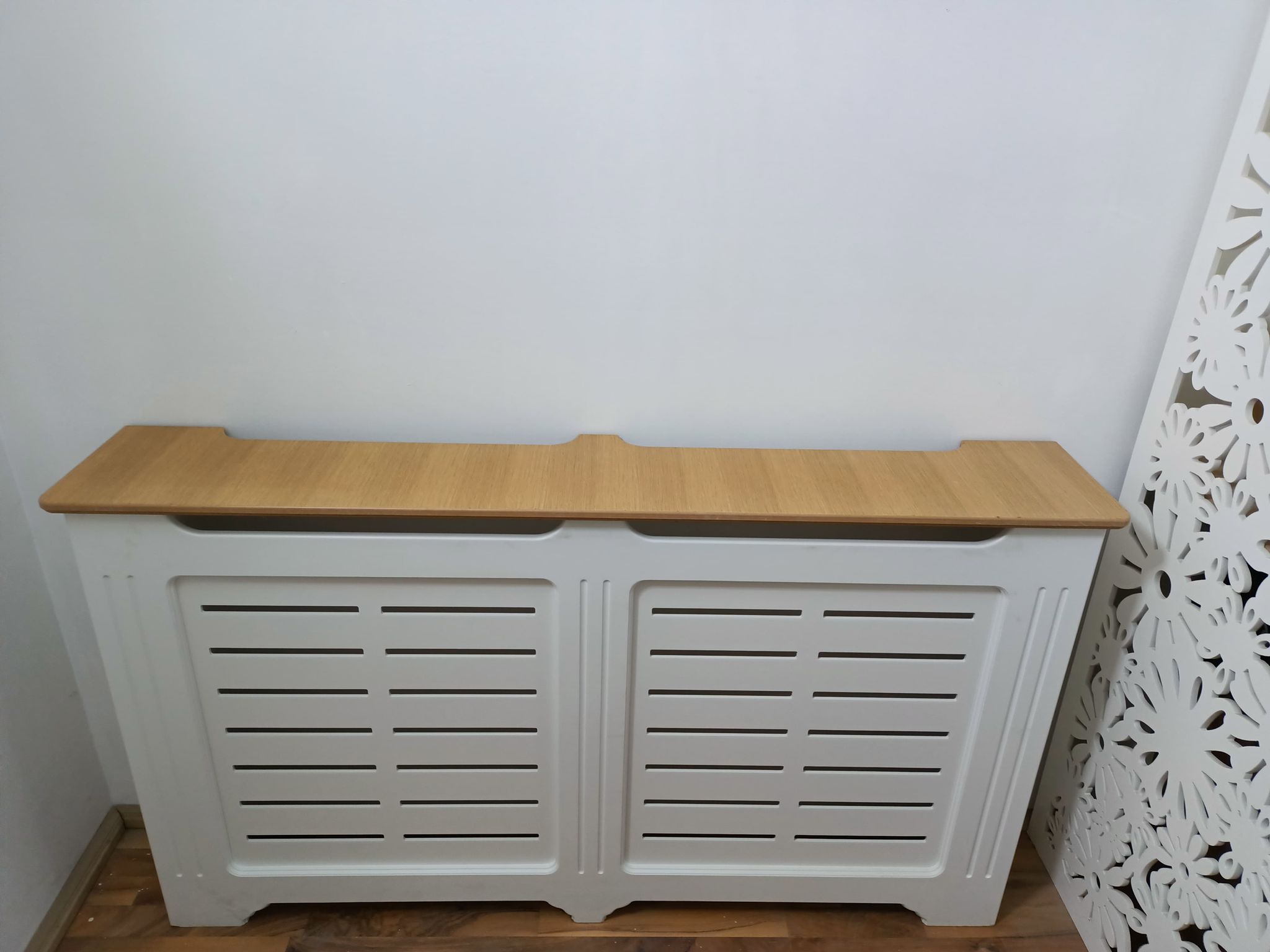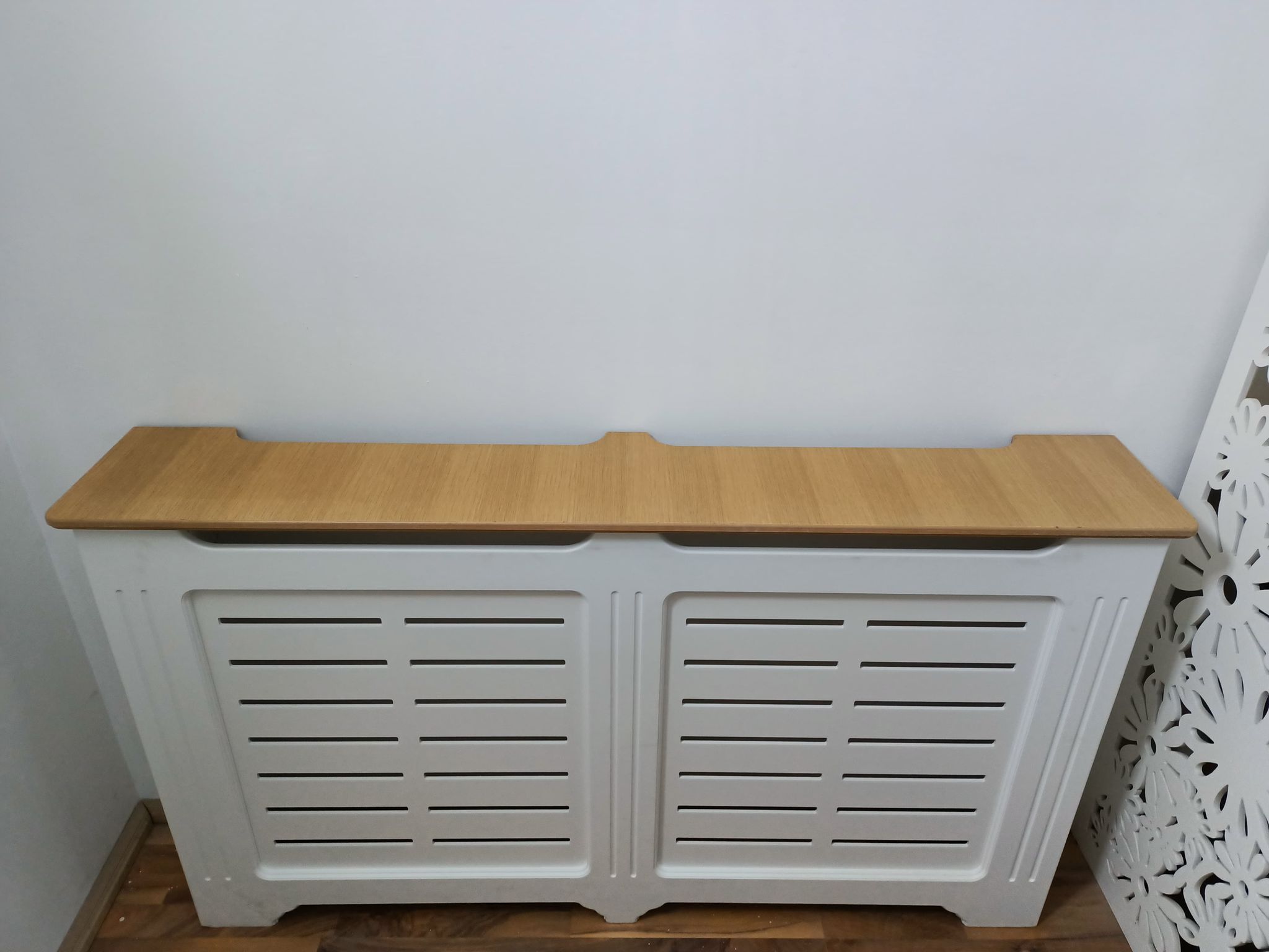 Masca de calorifer din material MDF vopsit alb, cu gravuri pe lateral si cu polita din MDF furniruit si baituit, nuanta stejar caramel.