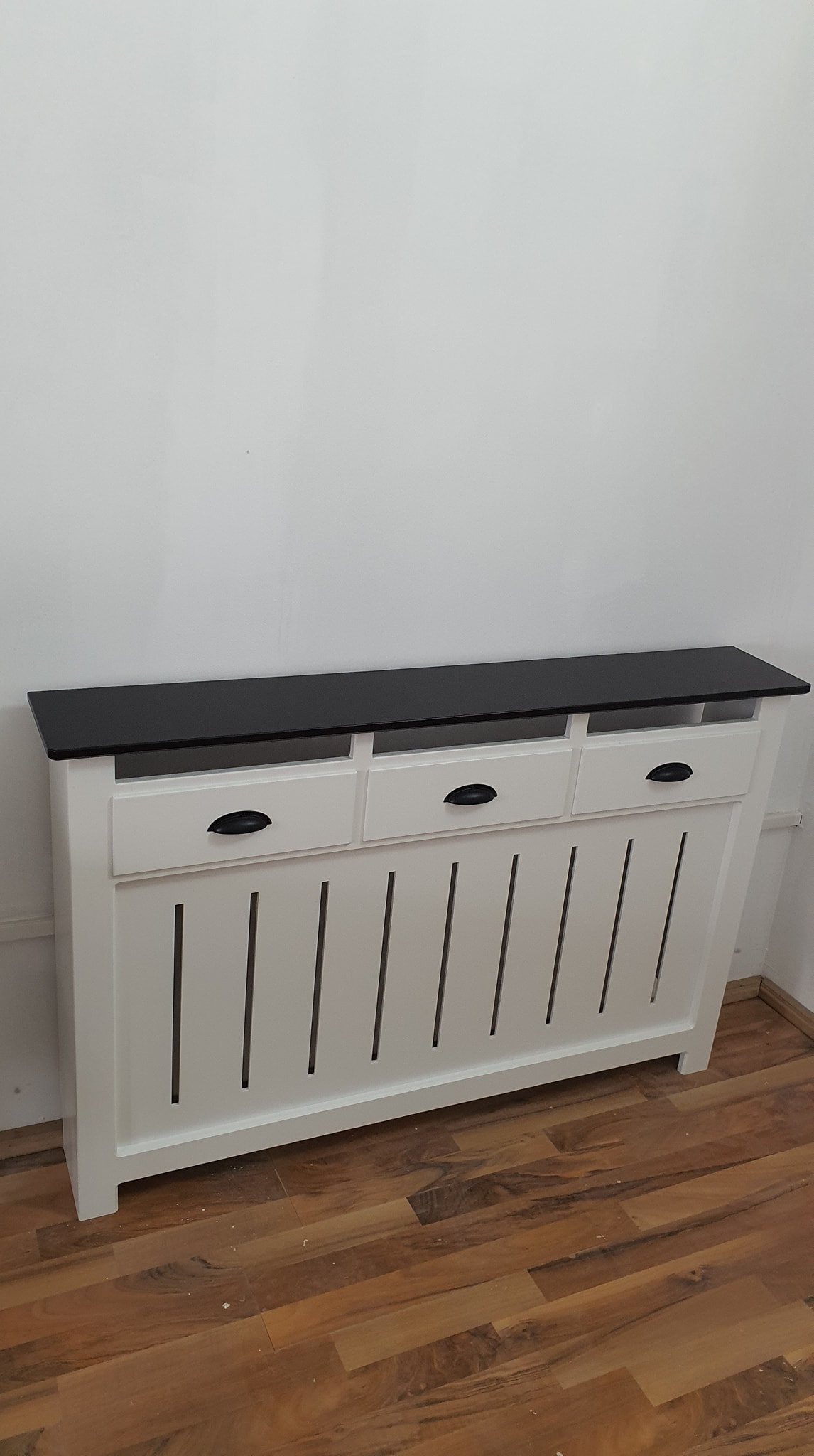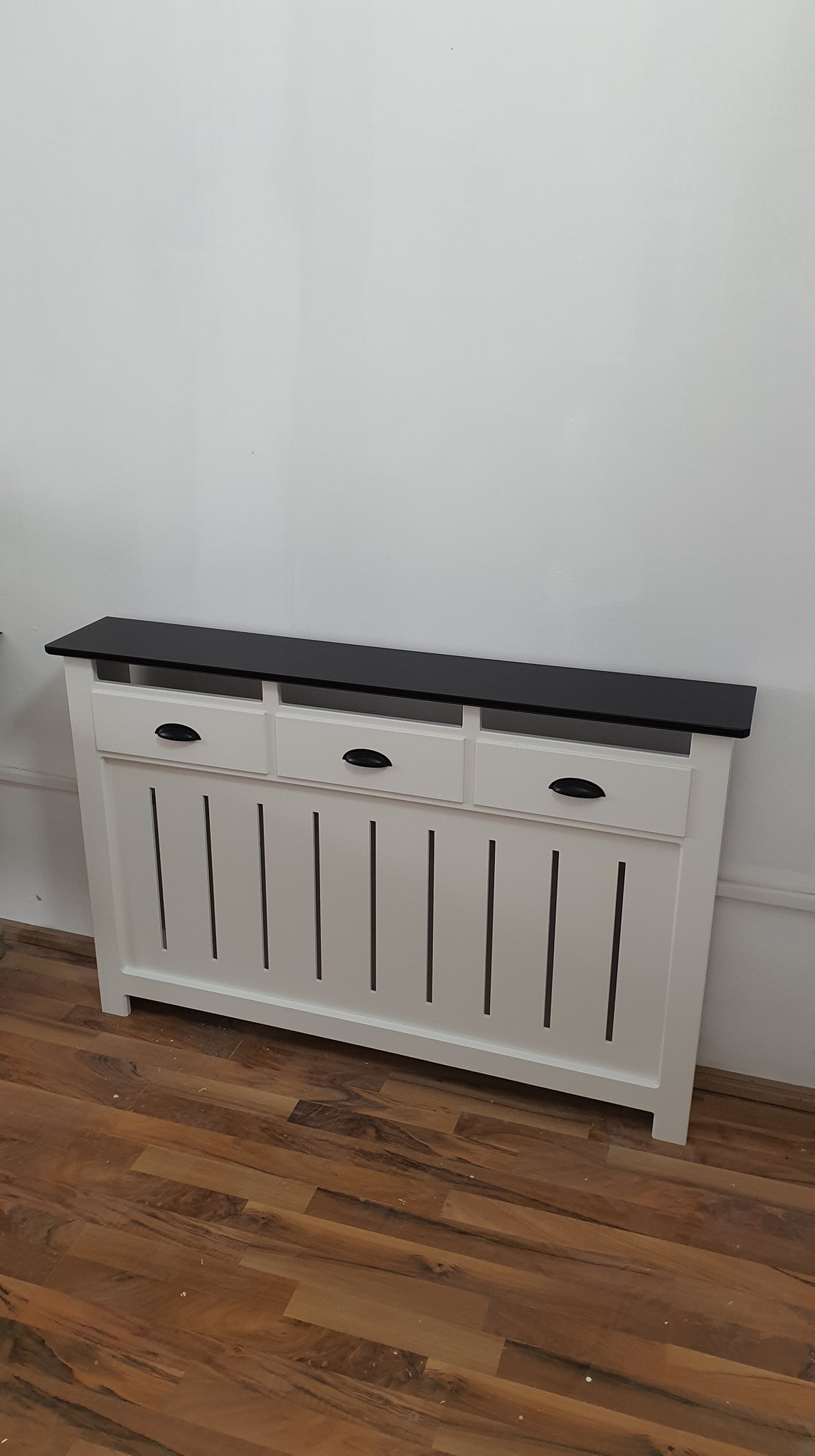 Masca de calorifer suspendata, din material MDF vopsit in doua nuante, cu sertare (nefunctionale, dar la cerere se pot realiza astfel incat sa fie functionale) si rafturi.