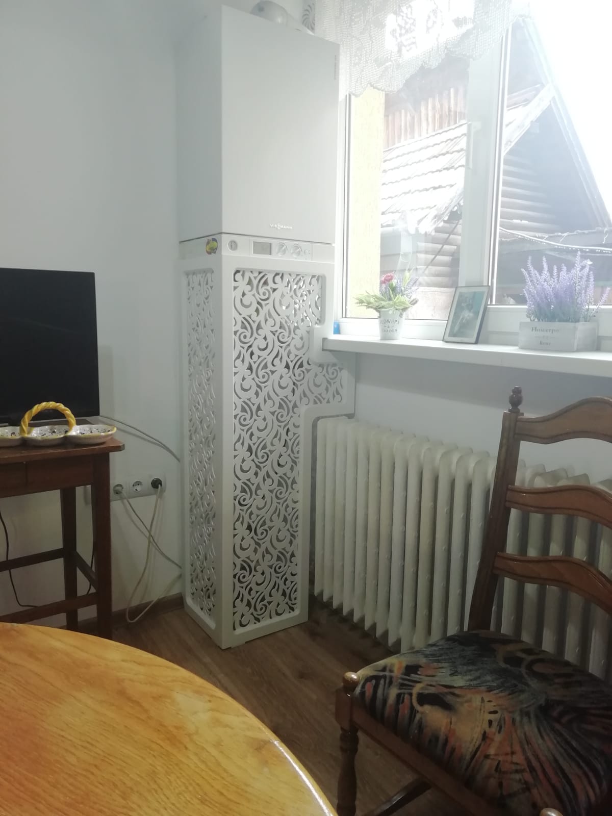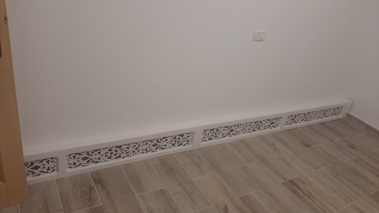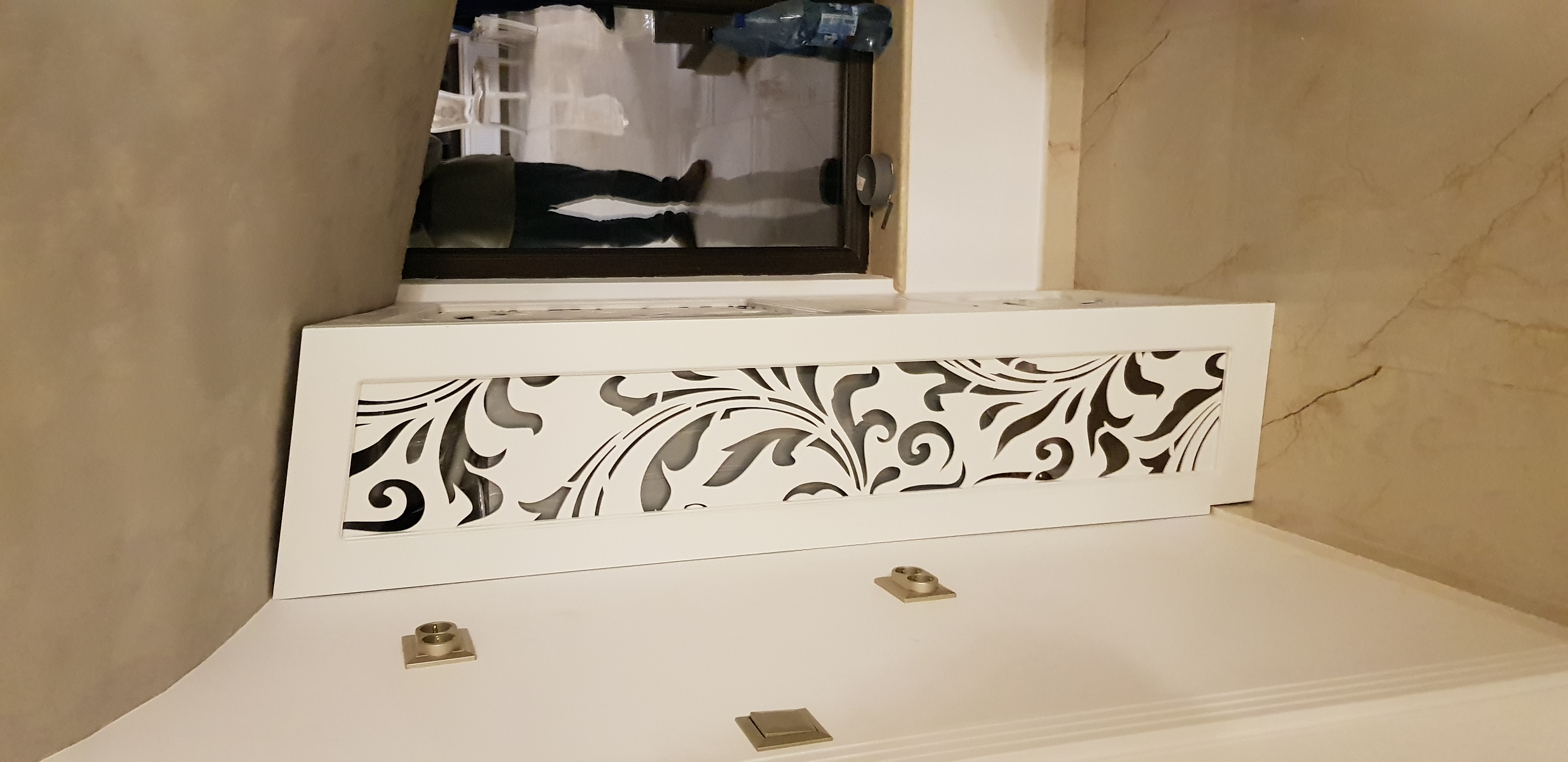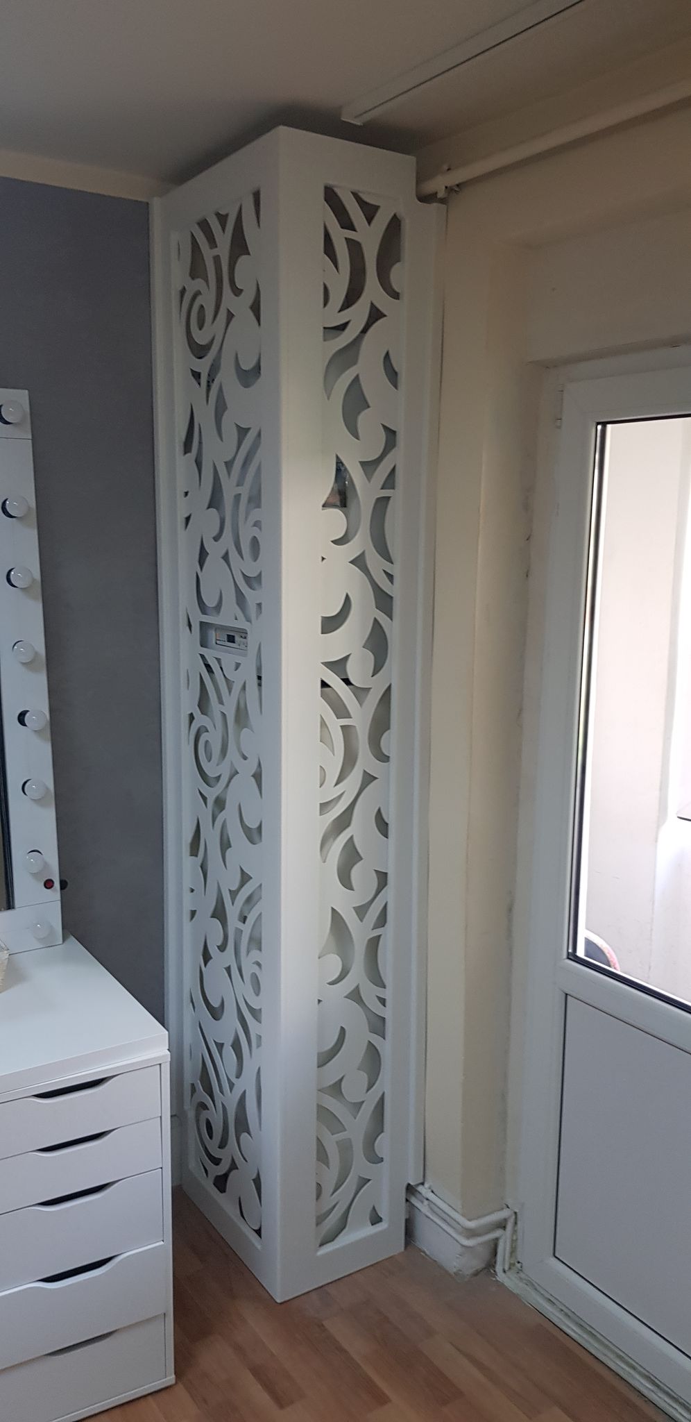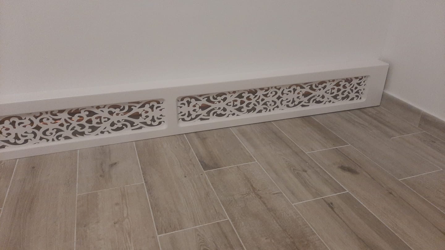 Masca pentru tevi vopsita, culoare la alegere din catalogul de culori RAL, material MDF. Material PVC se poate realiza doar pe alb. Extracost se va aplica pentru culorile metalizate, combinatiile de culori si MDF furniruit.